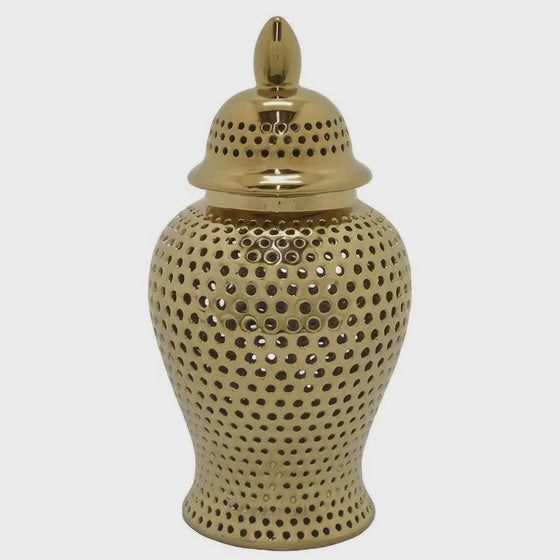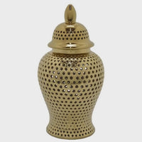 Deni 25 Inch Temple Jar, Small Carved Cut Out Lattice, Lid, Gold Ceramic - BM309967