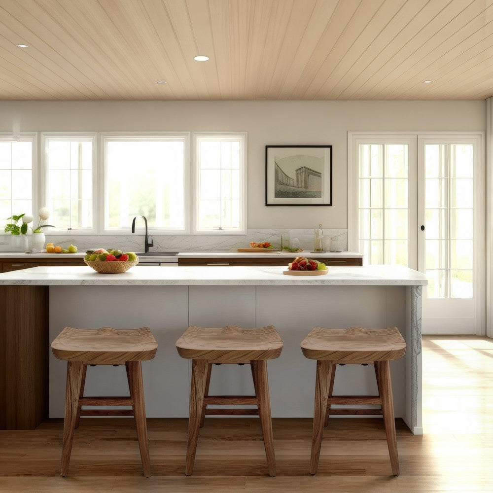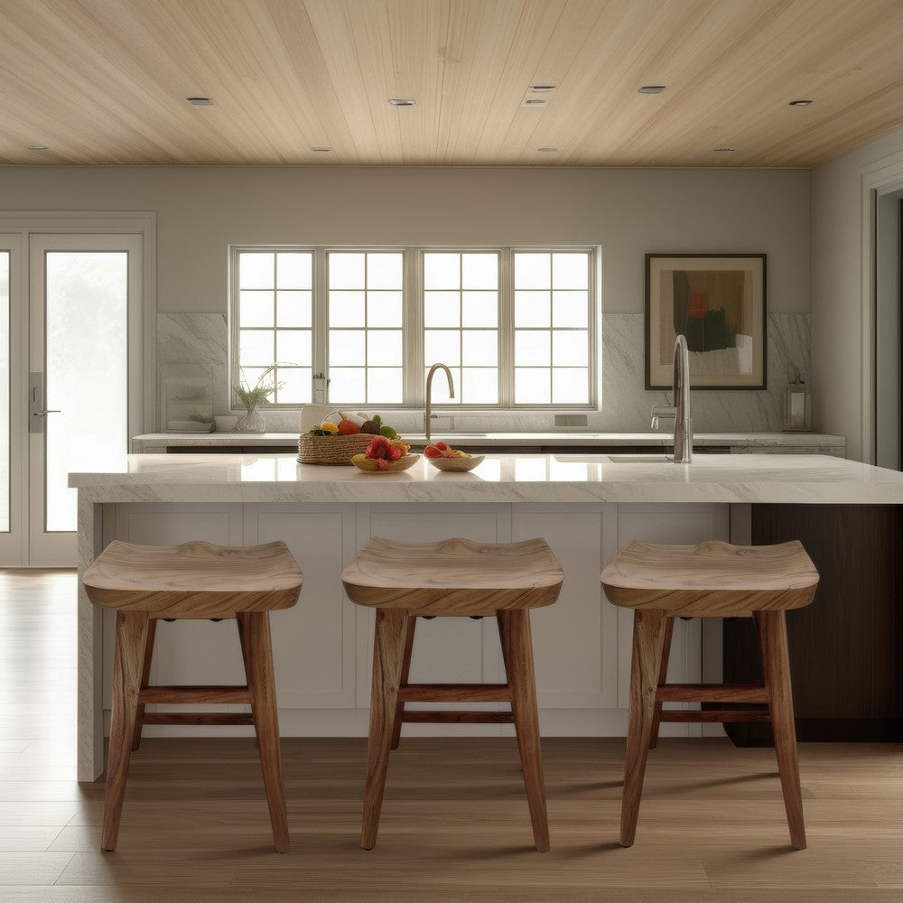 Naturalistic and elegantly designed, our Tisa handcrafted counter height stool lends a strong rustic aura and a touch of industrial aesthetics to any home. Handcrafted from premium grade acacia wood for lasting durability, this piece includes an ergonomic natural brown saddle seat for deep, sturdy comfort; its sturdy tapered legs offer excellent strength and a strong spacer footrest. It has floor protectors along the bottom that prevent damaging scratches or abrasions along the floor while keeping the stool stationary. The backless design adds a subtle touch to your home decor, while also offering effortless space saving and organization. Check out our Tisa collection for more sizes and matching pieces.