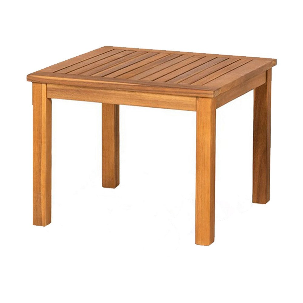 Step into a paradise of outdoor bliss with this distinctively beautiful three piece patio table and chair set. Crafted from durable acacia wood in a natural brown hue, it boasts an artful slatted design. The weather resistant feature and durable polyester upholstery ensure this set endures the elements, providing you with years of enjoyment and class.