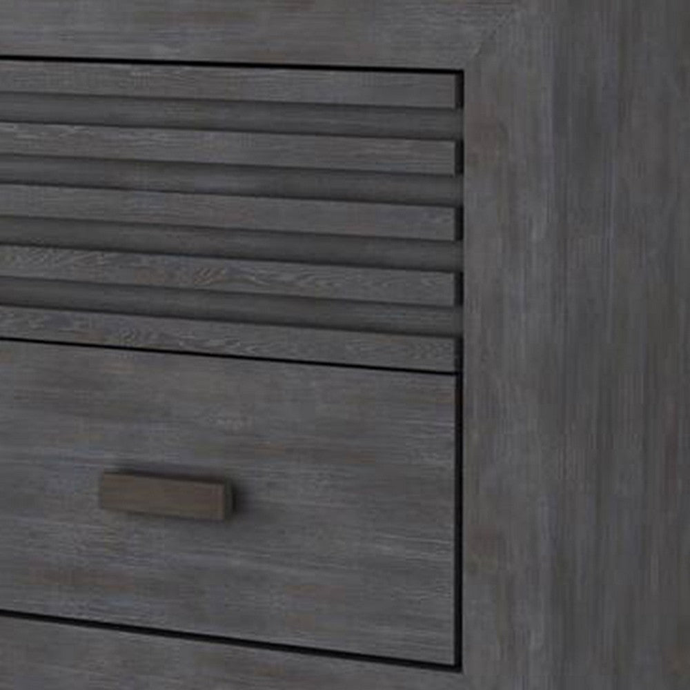 Elevate your bedroom with the versatile charm of this elegant and sophisticated nightstand. Crafted from solid hardwood and supported by tapered wood legs, it includes two spacious drawers for organizing bedside essentials or accessories. The slatted design on the top drawer and warm charcoal brown finish complete its transitional look. Explore our Biom collection for more options.