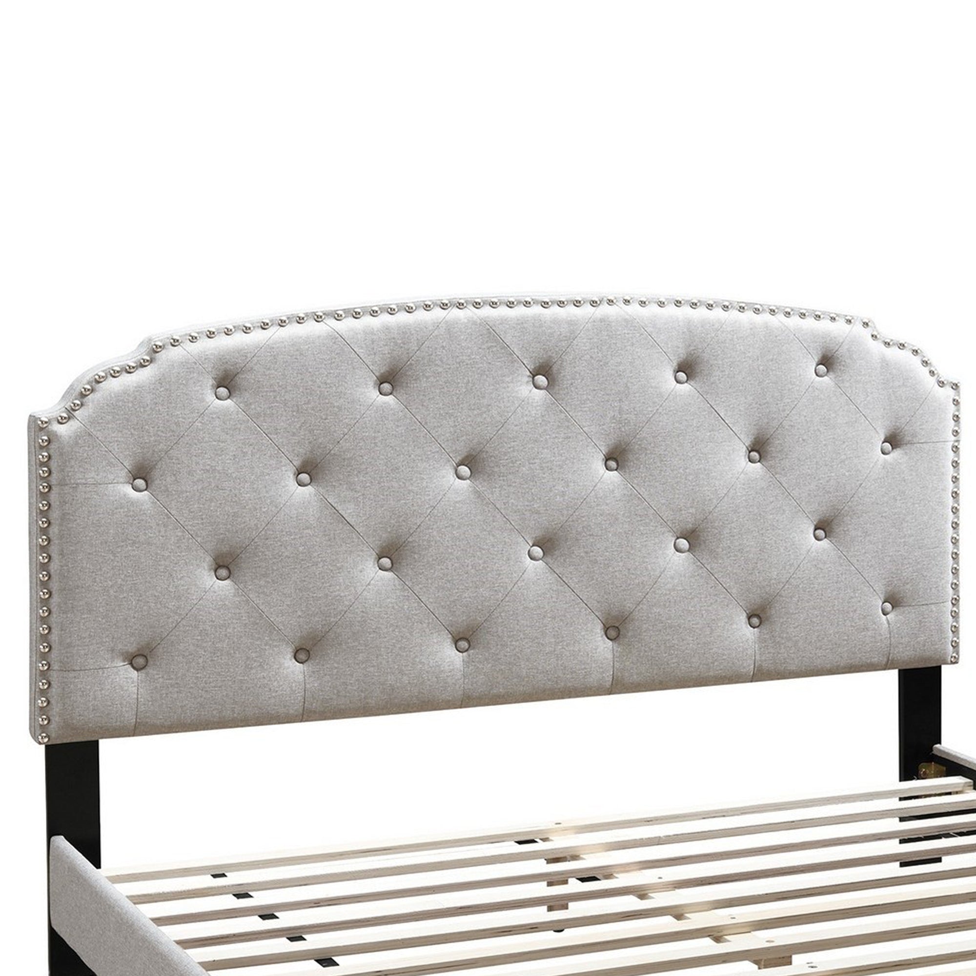 Combining elegance and comfort, this Twin Bed makes a perfect addition to your bedroom for an easy update to the existing setting. The nailhead trim, button tufted details, and a scalloped headboard add to its visual appeal. It boasts a sturdy construction of poplar wood, MDF, and particleboard for long lasting durability.