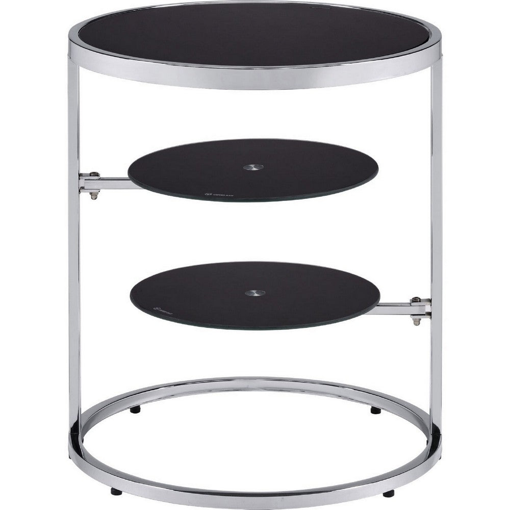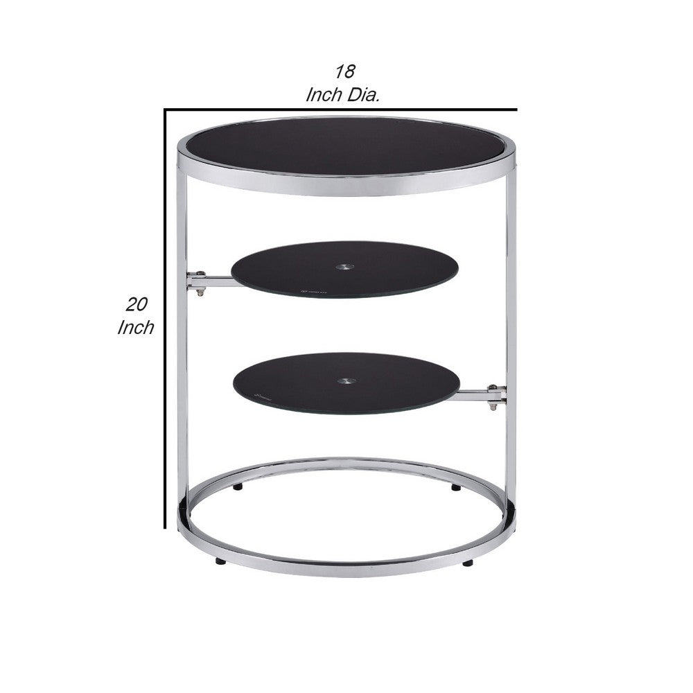 20 Inch Accent Table with 2 Tier Swivel Glass Shelves, Black and Chrome - BM250241