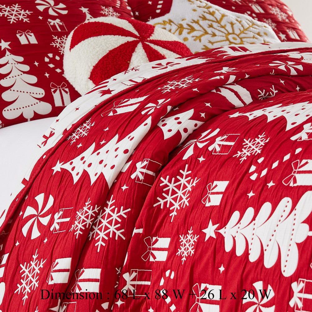 Bring festive warmth to your home with this jacquard woven three piece queen size throw quilt set. Crafted from durable polyester, this cozy set features a reversible holiday pattern of Christmas trees, presents, snowflakes, pinwheels, and candy canes in vibrant red and white. Explore our Daru collection for more options.