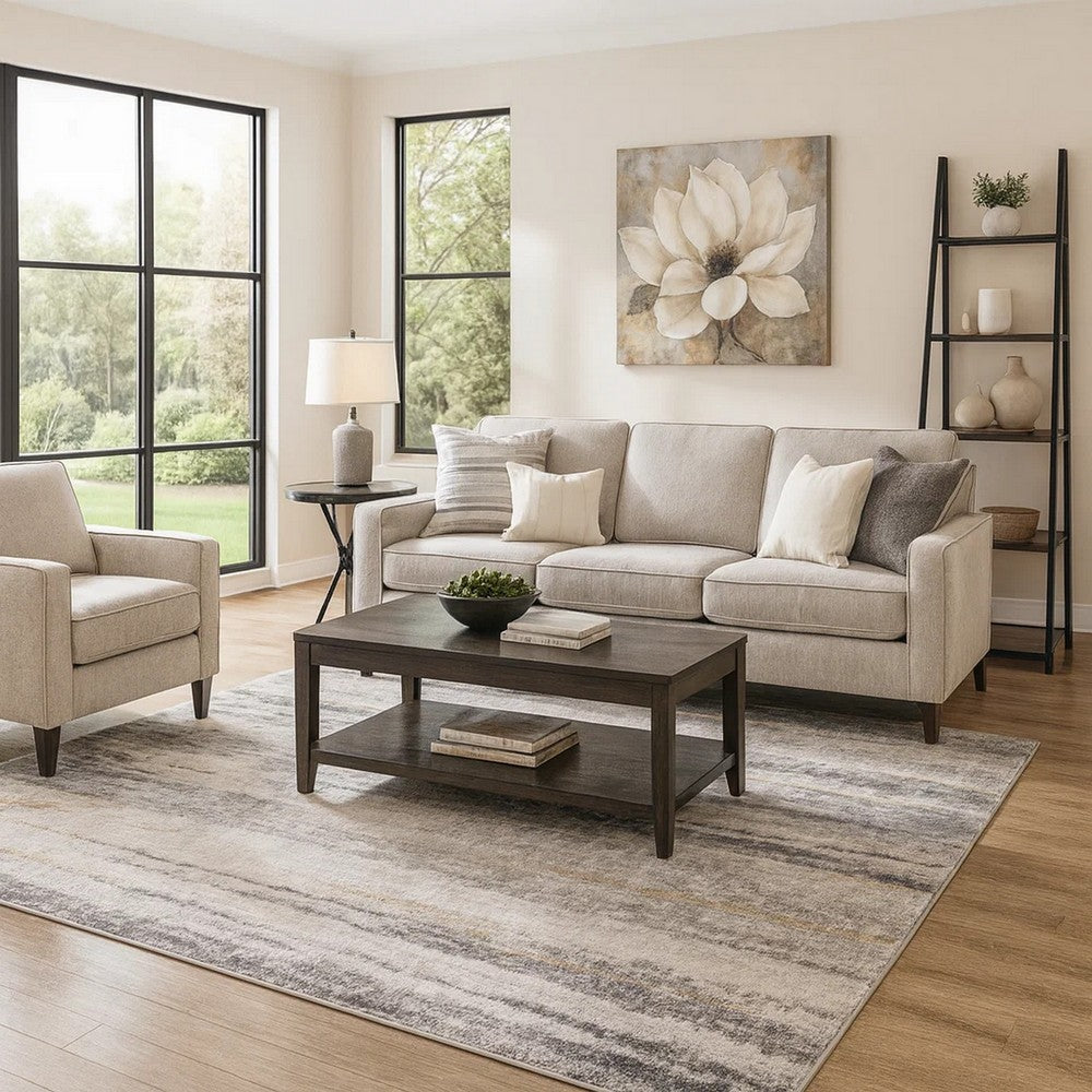 The trendy abstract design on this large floor area rug adds an elegant touch to your interior. Composed of pet friendly durable polyester, this jute backed area rug is easy to clean and soft to the touch. In shades of distressed cream, gold, sage, and gray, this piece will stand out with ease with a regal yet understated design. Check out our Oxy collection for more options