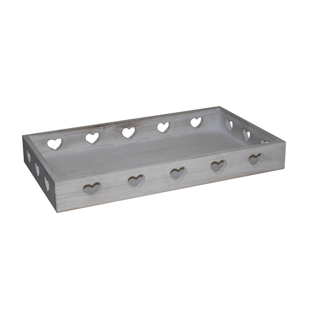 Farmhouse Style Rectangular Tray with Heart Shape Cutouts, Whitewashed - BM231486