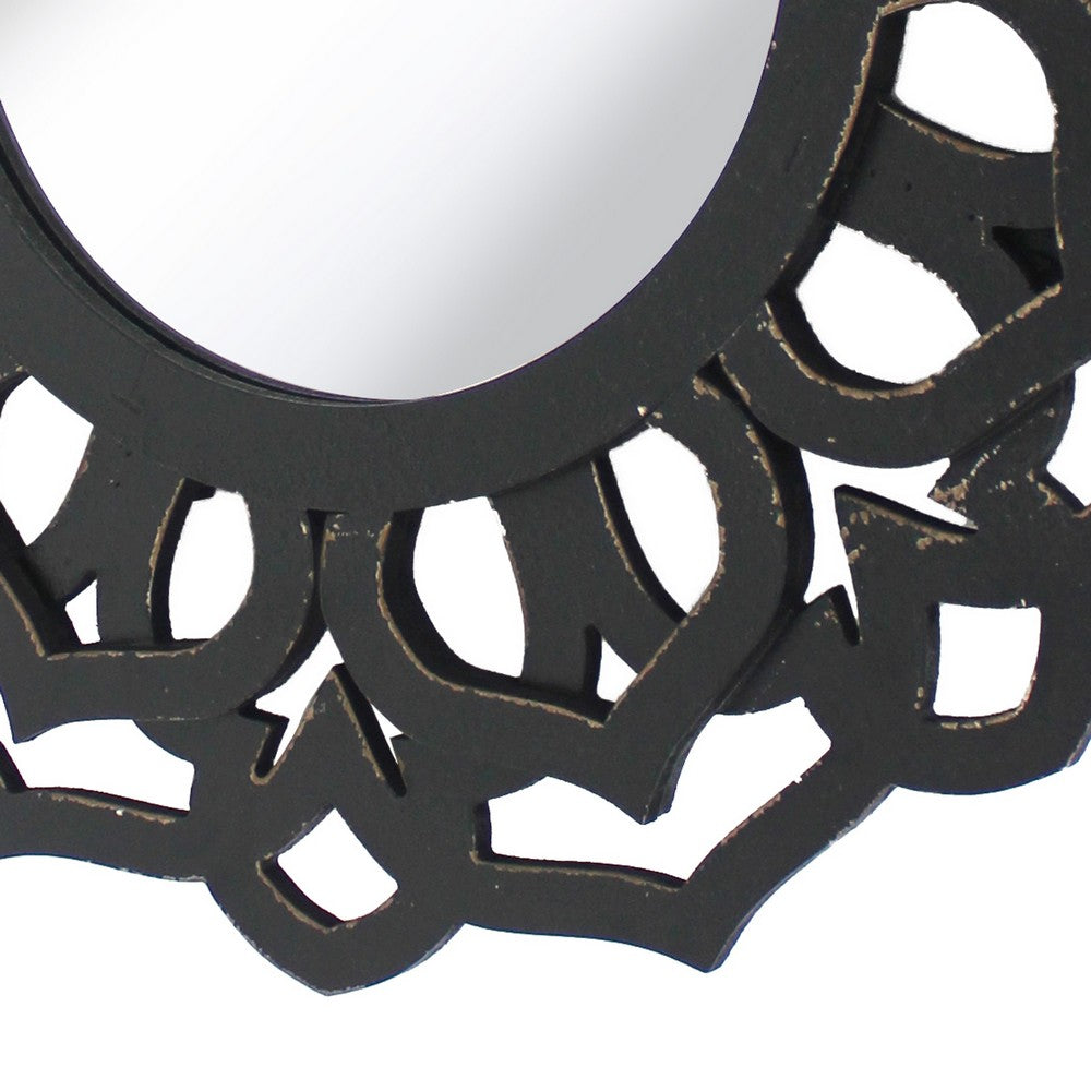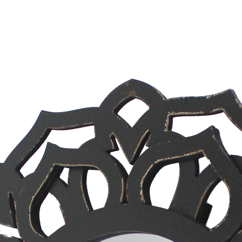 Wooden Mirror Blooming Lotus Wall Decor with Floral Engraving, Black - BM211081