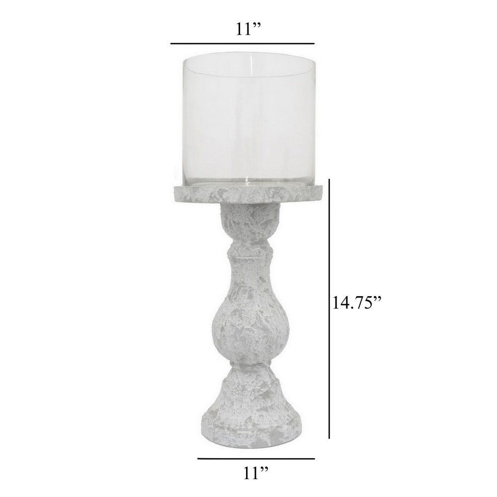 Elevate your home decor with this stunning ceramic candle holder featuring a timeless white-gray finish and intricate details. Its robust structure is complemented by a vintage-inspired pedestal base and a clear glass hurricane top, adding elegance to any setting. Perfect as a centerpiece or accent piece, it enhances living spaces with charm. Check out our Kris collection for more.