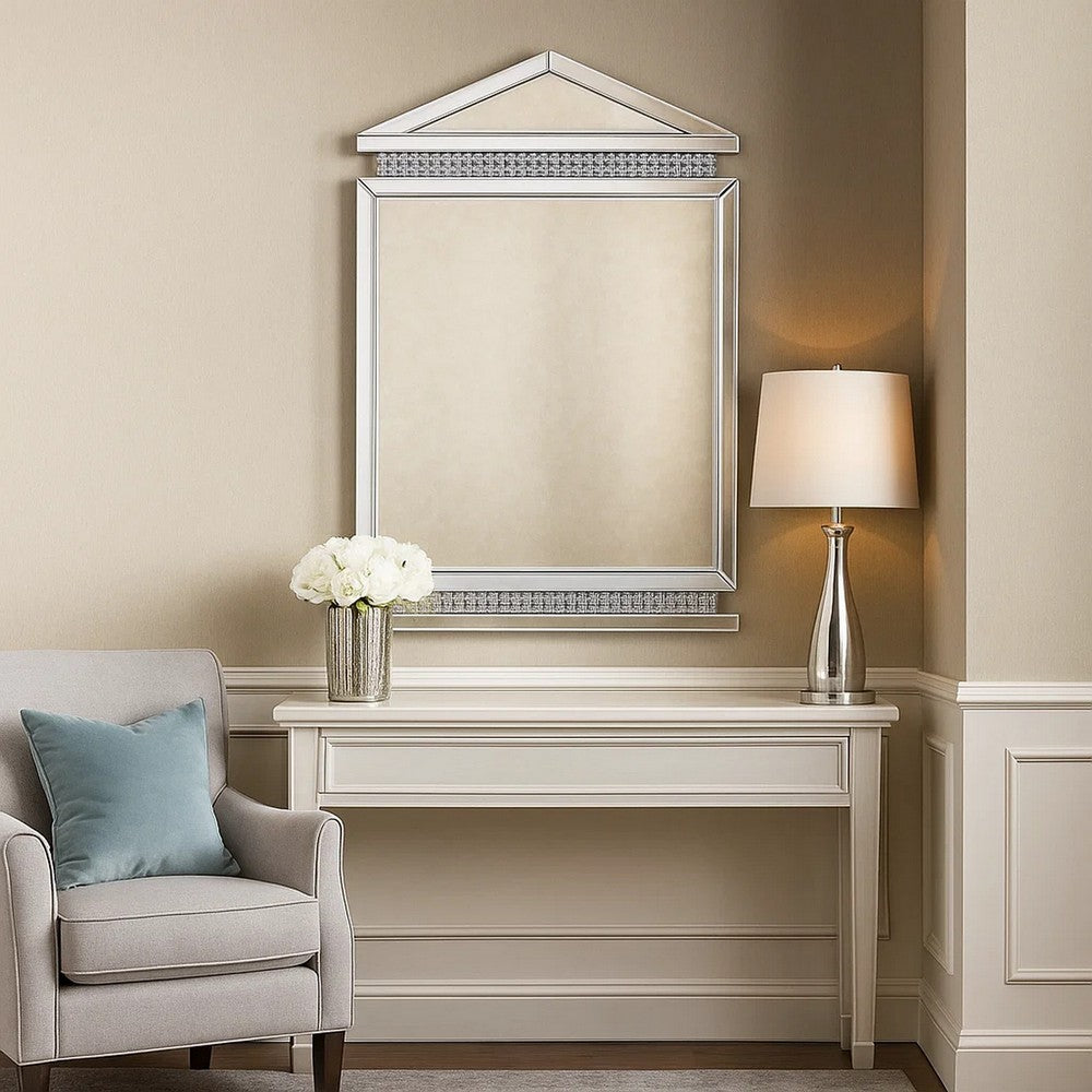 Rectangular Mirror Wall Decor with Faux Crystals and Triangular Top, Silver - BM238113