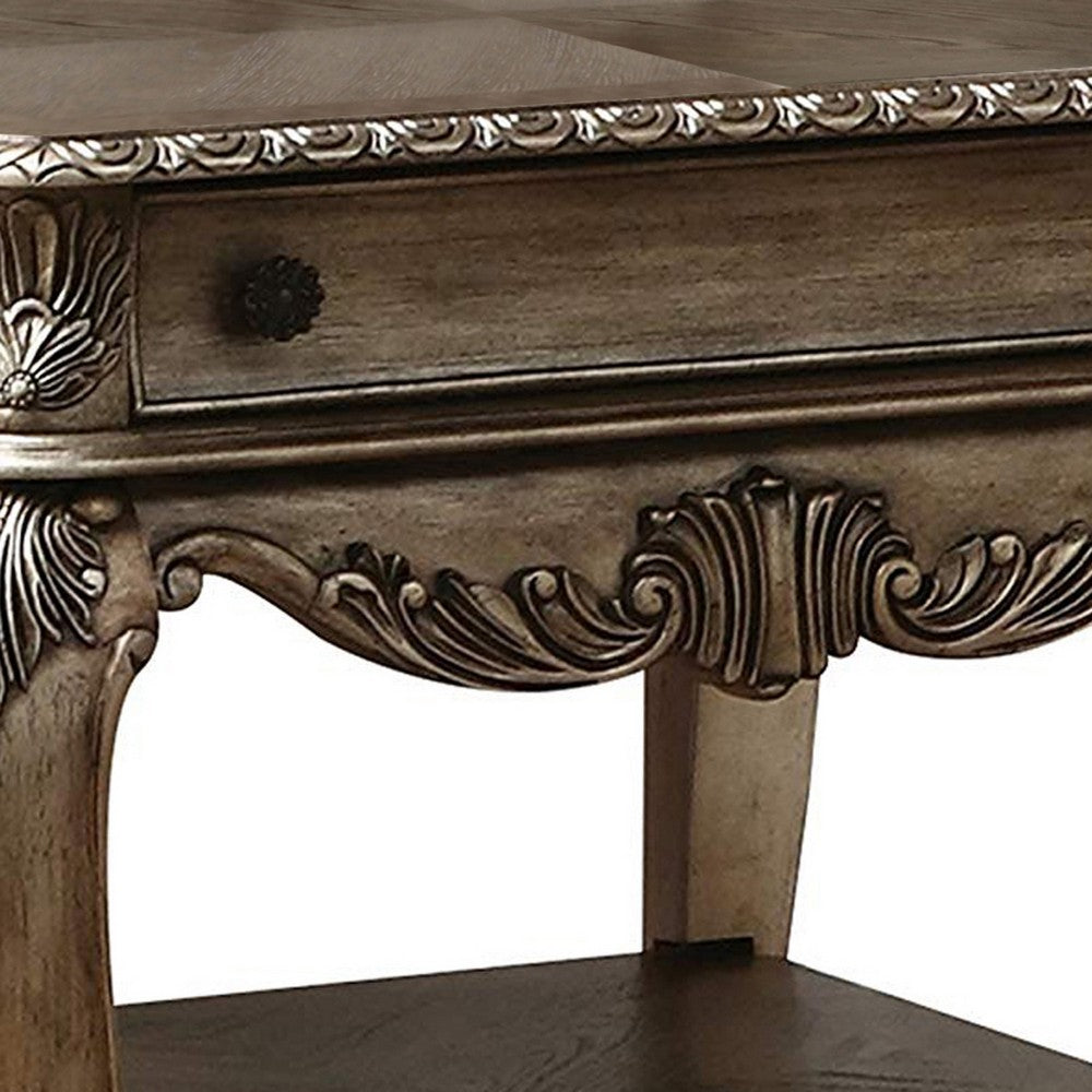Adorn your home space in an elegant way with this vintage looking end table. This end table finishes vintage oak brown with scrolled apron and cabriolet Legs design. Its functionality and beauty got enhance with its old-style designing. Made up of oak wood, this end table comprises of one drawer with two metal knobs and one bottom shelf for extra storage space. With dark color knob accents on vintage oak finish make this end table to offer an unusual style. Does not include any featured product other than one end table.