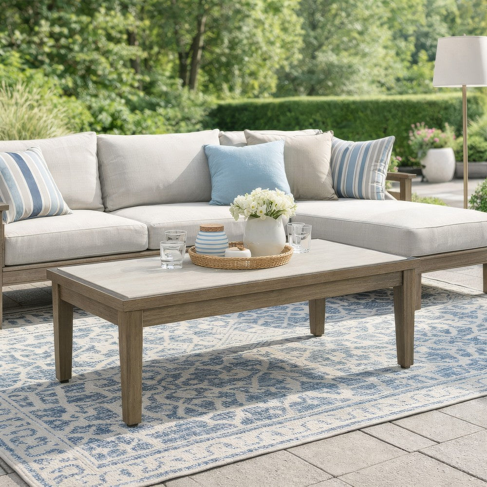 This rectangular cocktail table combines rugged durability with contemporary design, making it an ideal centerpiece. Crafted with a rust-resistant metal frame finished in a sleek brown wood-look powder coat, its beige sintered stone table top mimics the look of natural stone, ensuring resistance to stains and moisture. Check out our Inaya collection for more options.