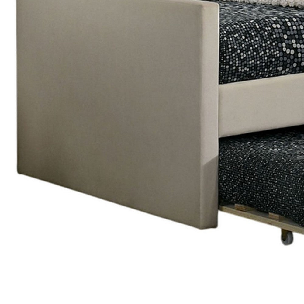 This beige twin daybed with trundle is a versatile piece for any modern space. Its staircase-inspired headboard with vertical channel tufting creates an eye-catching look. Softly sloped track armrests add extra comfort for lounging, while the fully upholstered beige fabric frame brings warmth and texture that seamlessly blends style with practicality. Explore our Oren collection for more options.