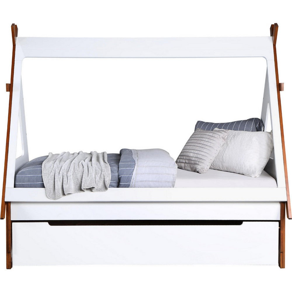 Teo Wood Twin Bed, House Shaped Bed Frame, Slat System, Brown, White - BM284029