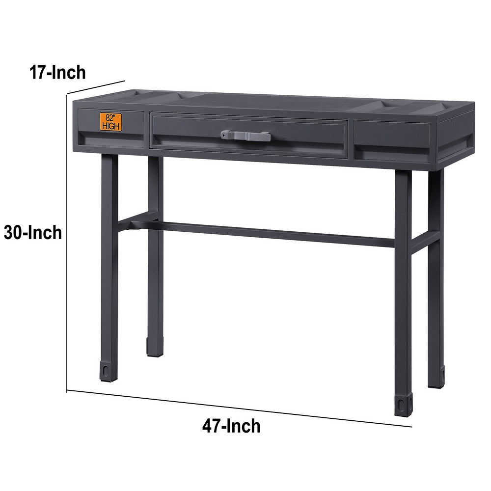 Add an industrial touch to your home d‹¨«cor with the addition of this vanity desk. Constructed sturdily from metal and wood, it features recessed panel design and a spacious drawer which offers ample space for the storage of make up items. Supported on straight legs for the stability, it incorporates a gray finish imparting elegance to its design. This vanity desk finds a perfect place in your bedroom or dressing area.
