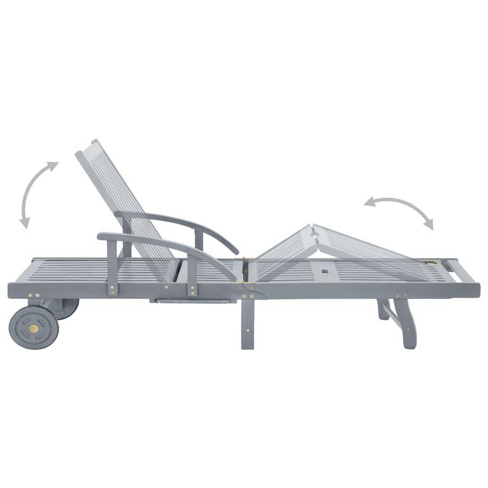 Relax in style with this outdoor sun lounger crafted from solid acacia wood in a sleek gray finish. Its slatted design enhances airflow, keeping you cool and comfortable. The lounger features an adjustable backrest for personalized reclining positions. A side pull-out tray provides a handy spot for drinks or essentials, with built-in wheels for easy mobility and a foldable frame for storage.