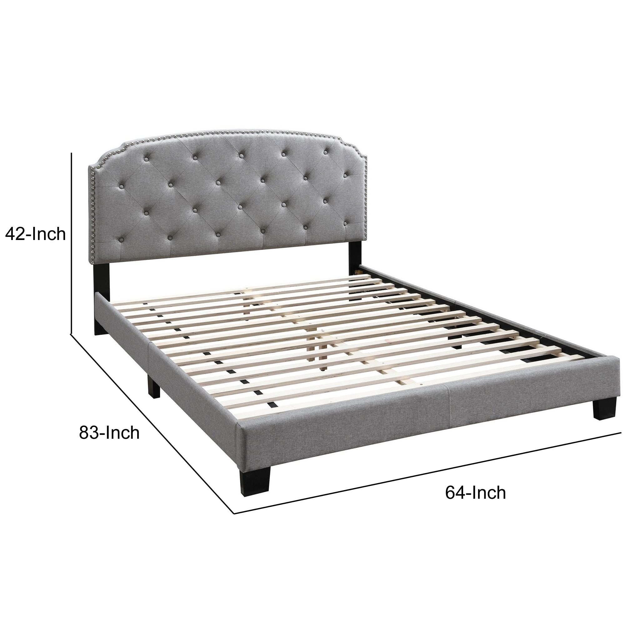 Combining elegance and comfort, this Queen Bed makes a perfect addition to your bedroom for an easy update to the existing setting. The nailhead trim, button tufted details, and a scalloped headboard add to its visual appeal. It boasts a sturdy construction of poplar wood, MDF, and particleboard for long lasting durability.