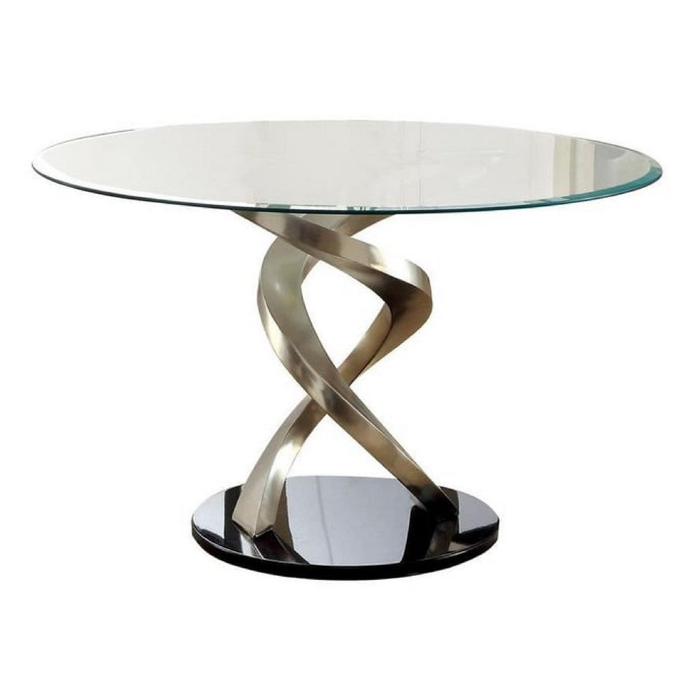 Elevate your dining space with this five-piece contemporary set featuring a round 10mm tempered glass table top supported by a tapering elliptical post base. Four coordinating chairs include ladder backs, padded microfiber seats, and black bases for comfort and style. This set combines sleek metal frames, durable materials, and functional design. Check out our Roxe collection for more options.