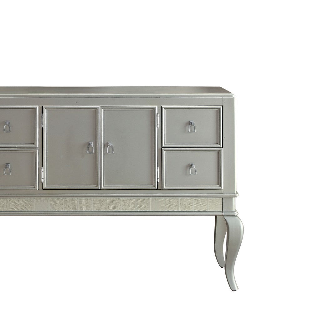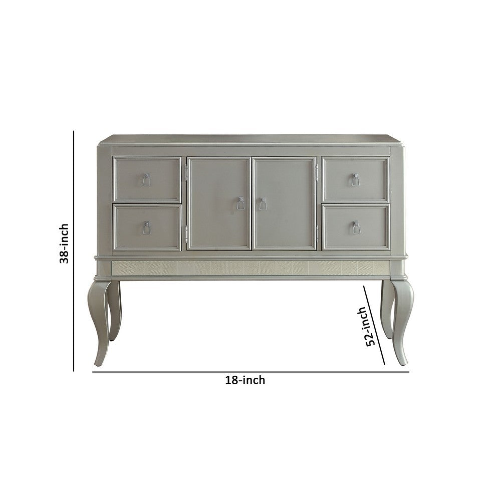 Keep your dining area organized with this stunning server. It features cabriole leg support with four spacious drawers and two doors that can be used to store cutlery, plates, table mats, napkins etc. Finished in a champagne silver color, this wooden server offers a sleek appeal to any setting in a living space. The smooth top of this server can be used to place small vases with beautiful fragmented flowers. The veneer wooden construction gives it the edge of strength, immense resistance, and a robust structure.
