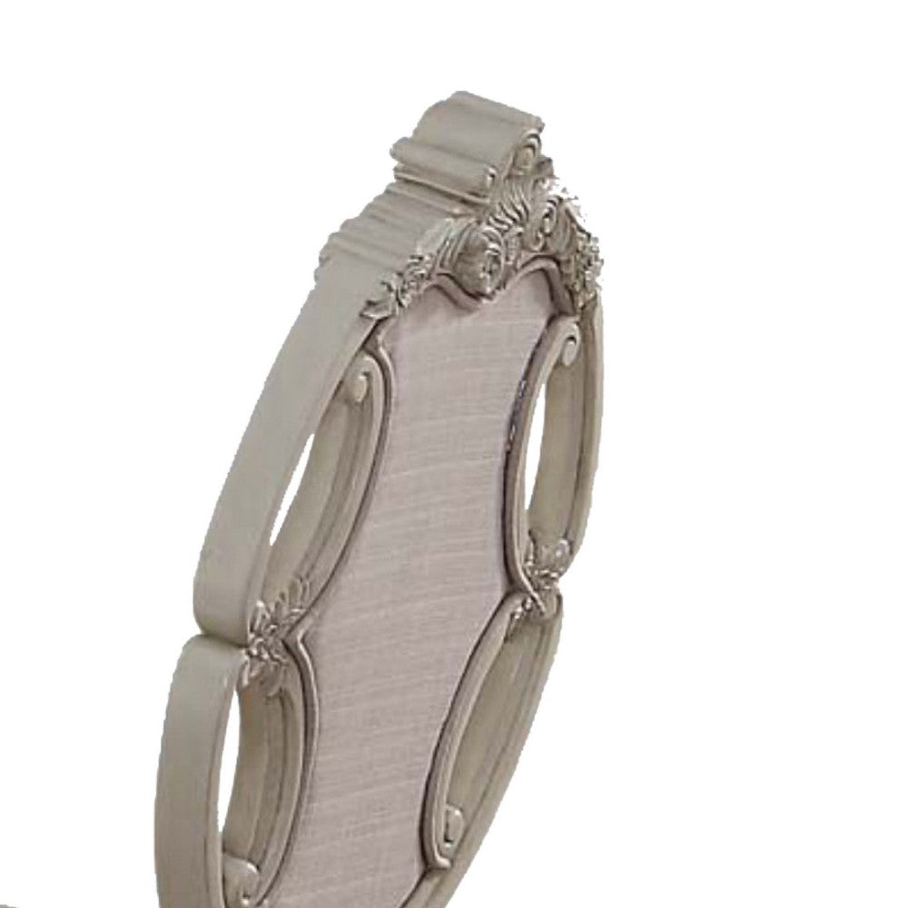 Classic meets modern with this two piece dining chair set. Padded seats and button tufted backrests ensure comfort. Quality pinewood and sturdy cabriole front legs and flared rear legs promise durability. An oval back a with carved molded design, a tasteful pinewood veneer, and an antique white finish make this set irresistible.