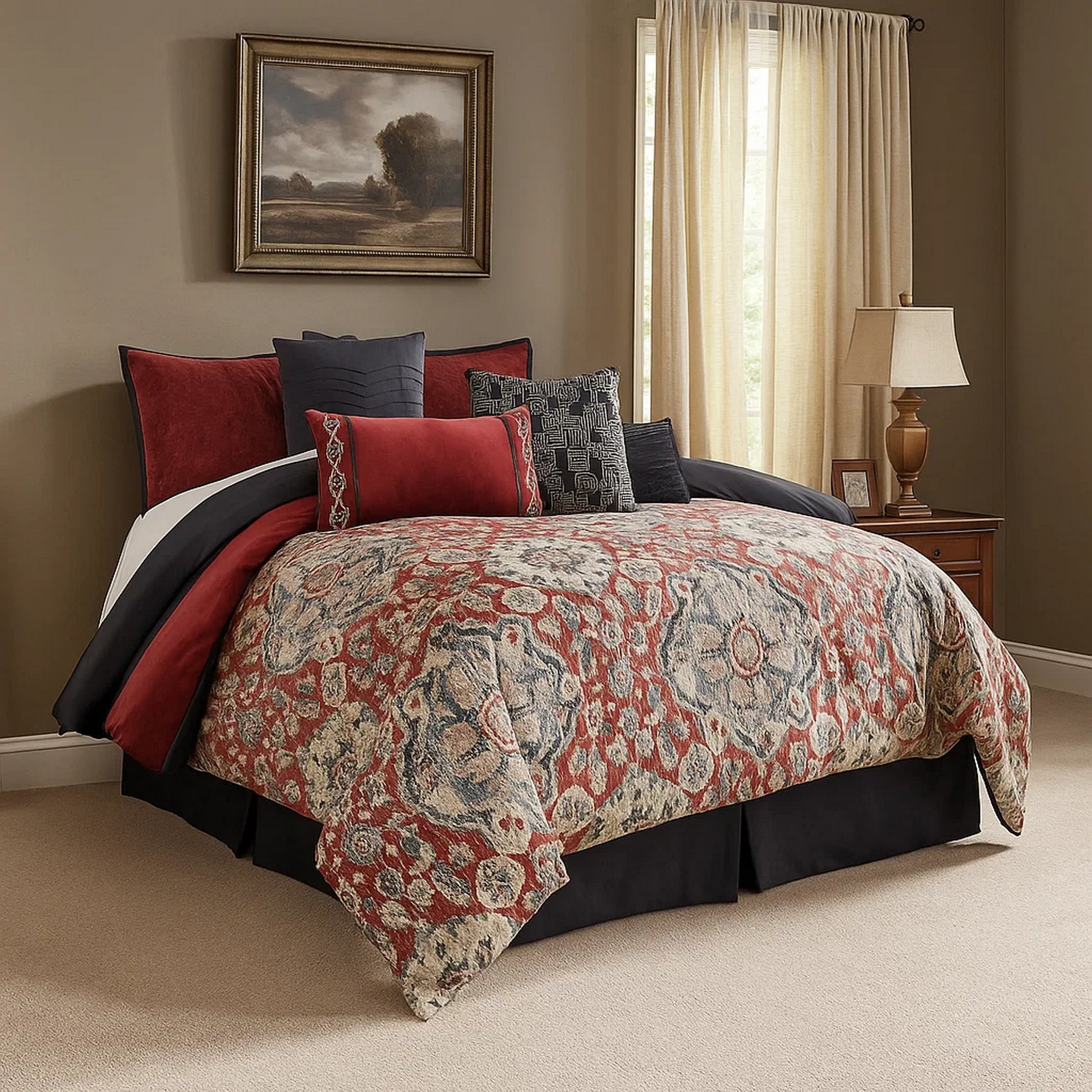 9 Piece Queen Size Comforter Set with Medallion Print, Red and Blue - BM225196