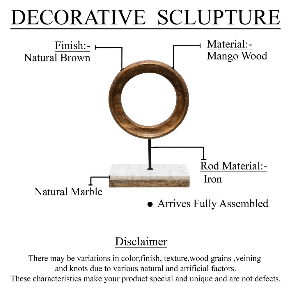 Add a touch of contemporary sophistication to your home decor with this beautifully crafted decorative sculpture. Featuring a minimalist circular design, this piece is composed of a rich natural brown mango wood ring, elegantly balanced on a sleek iron rod and mounted atop a solid natural white marble base. The fusion of organic and industrial elements gives this sculpture an artistic presence that€™s both modern and timeless. Its clean lines and mixed materials make it an ideal accent for consoles, shelves, office desks, or tabletops bringing warmth and sculptural dimension to any space. As a fixed design, it€™s sturdy and ready to display right out of the box, offering instant visual appeal.