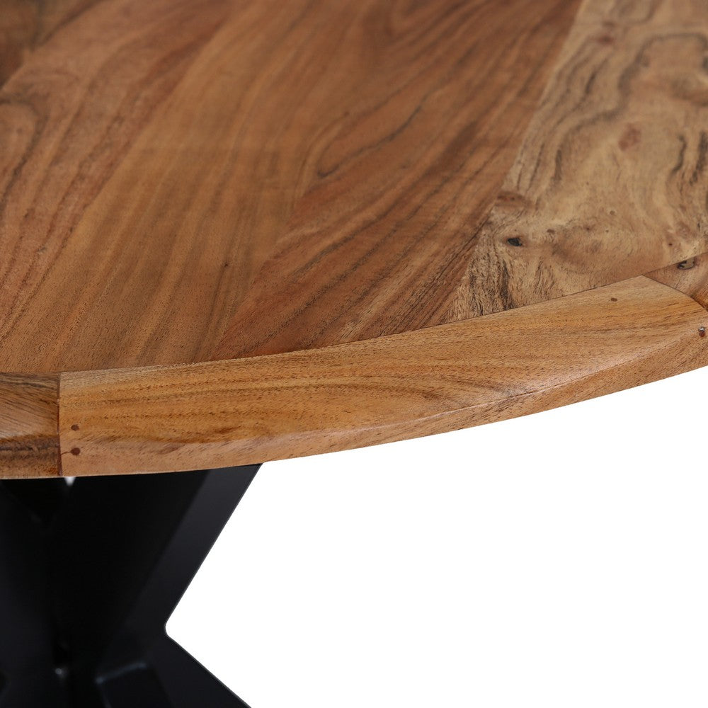 One of a kind and limited in stock, this round dinner table is handcrafted with unique, natural differentiation to transform your living room or lounge into a masterclass of artisanship and high taste. The natural brown live edge solid acacia wood tabletop is gorgeous and durably made to easily resist wear. Also, the round top is supported by thick, straight double, crossed iron metal legs for a touch of balanced structure. The perfect contrast of light natural brown and striking jet black brings forth a distinguished yet enchanting aura to your home, and this piece's crisp, clean lines and classic style allow for it to readily blend with any variety of interior decor. Check out our Kuri collection for more options.