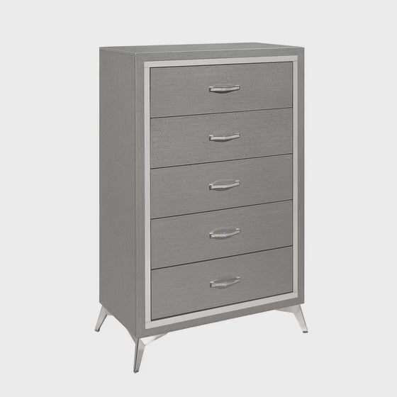 Declutter your bedroom in luxurious style with this gorgeous tall dresser chest. Made with quality MDF, this piece features embossed patterns on a smooth gray surface while the elegant mirror trim and diamond inlaid handles make for an eye catching accent. The five spacious drawers are perfect for storing clothes and linens with ease and charm. Check out our Sami collection for matching items.