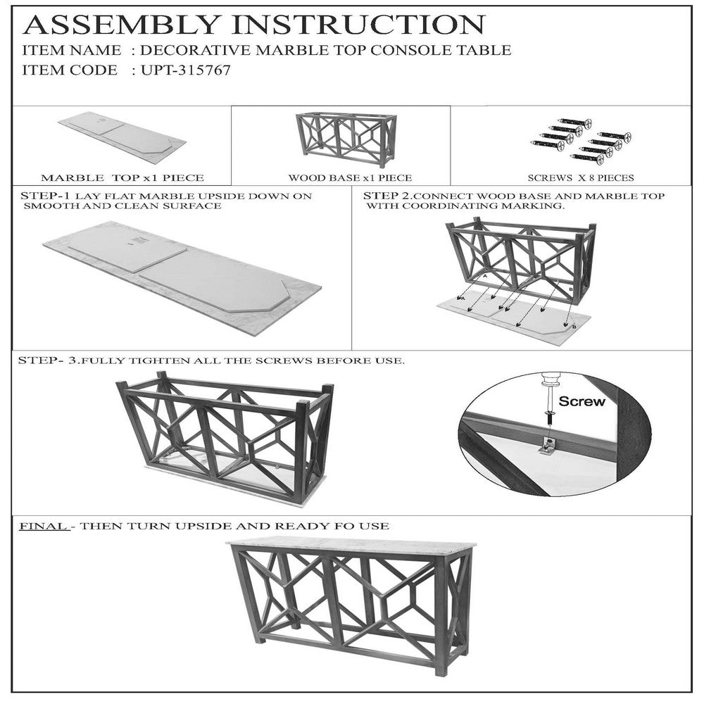 Enhance your entryway with this delightful sofa console table, designed with rustic country charm in mind. Crafted from durable, premium-grade mango wood, this table boasts a robust construction designed to last for years. A stunning genuine marble top sits atop the table, providing an elegant surface for displaying your favorite accessories, cherished photographs, and unique collectibles. The marble adds a touch of sophistication while offering a durable and easy-to-clean surface. The geometric-inspired design of the frame create a visually appealing silhouette, adding depth and dimension to any room. Whether placed in your entryway or living room, this console table perfectly marries rustic country charm with modern sensibilities, making it an ideal choice for those looking to add a touch of elegance to their home. Check out our Agas collection for matching set pieces.