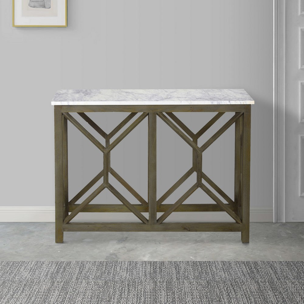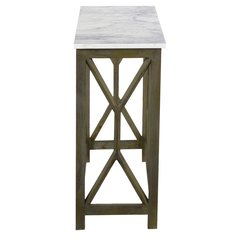 Agas Sofa Console Table, 41 Inch White Genuine Marble Top, Sandblasted Washed Ash Gray Mango Wood Geometric Frame