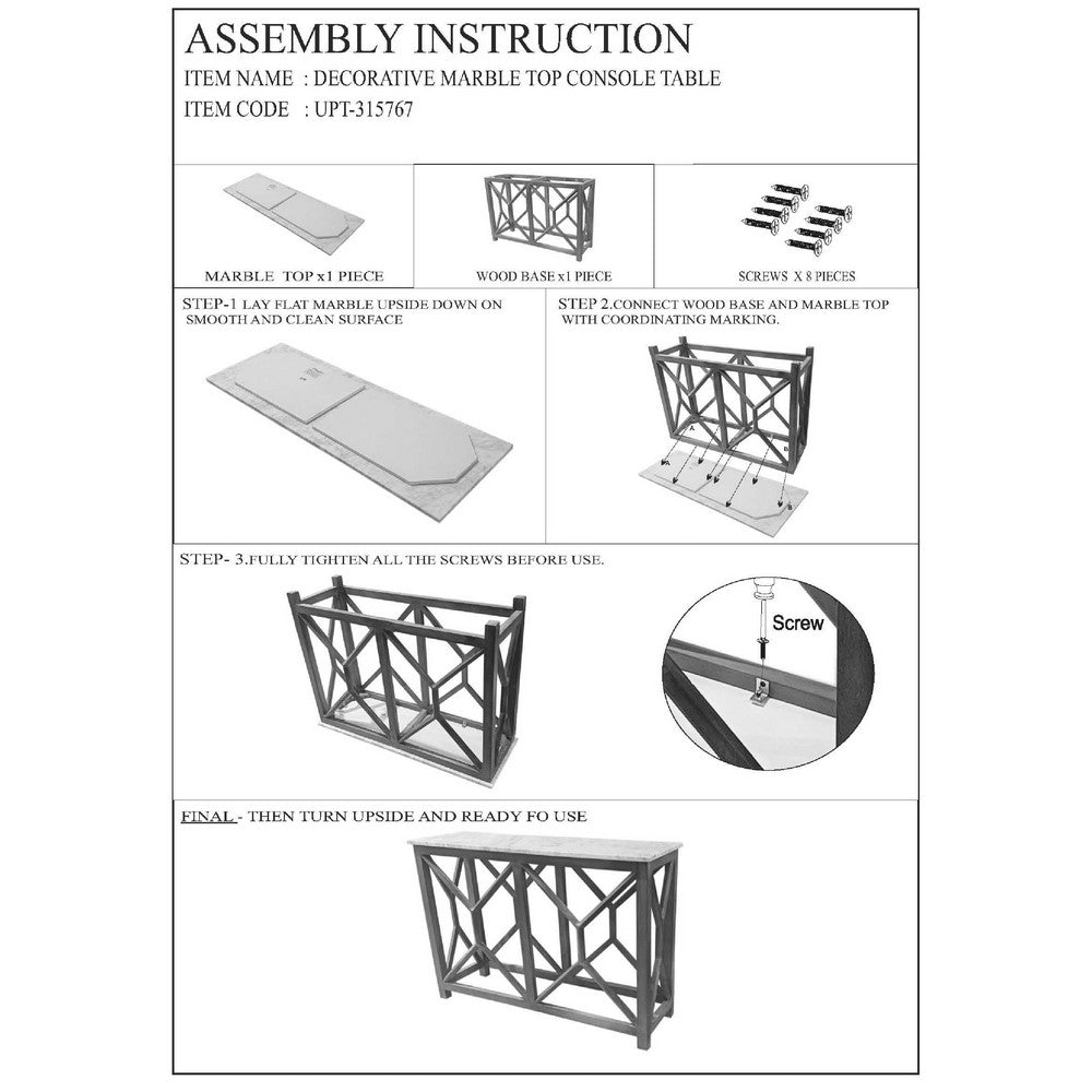 Enhance your entryway with this delightful sofa console table, designed with rustic country charm in mind. Crafted from durable, premium-grade mango wood, this table boasts a robust construction designed to last for years. A stunning genuine marble top sits atop the table, providing an elegant surface for displaying your favorite accessories, cherished photographs, and unique collectibles. The marble adds a touch of sophistication while offering a durable and easy-to-clean surface. The geometric-inspired design of the frame create a visually appealing silhouette, adding depth and dimension to any room. Whether placed in your entryway or living room, this console table perfectly marries rustic country charm with modern sensibilities, making it an ideal choice for those looking to add a touch of elegance to their home. Check out our Agas collection for matching set pieces.
