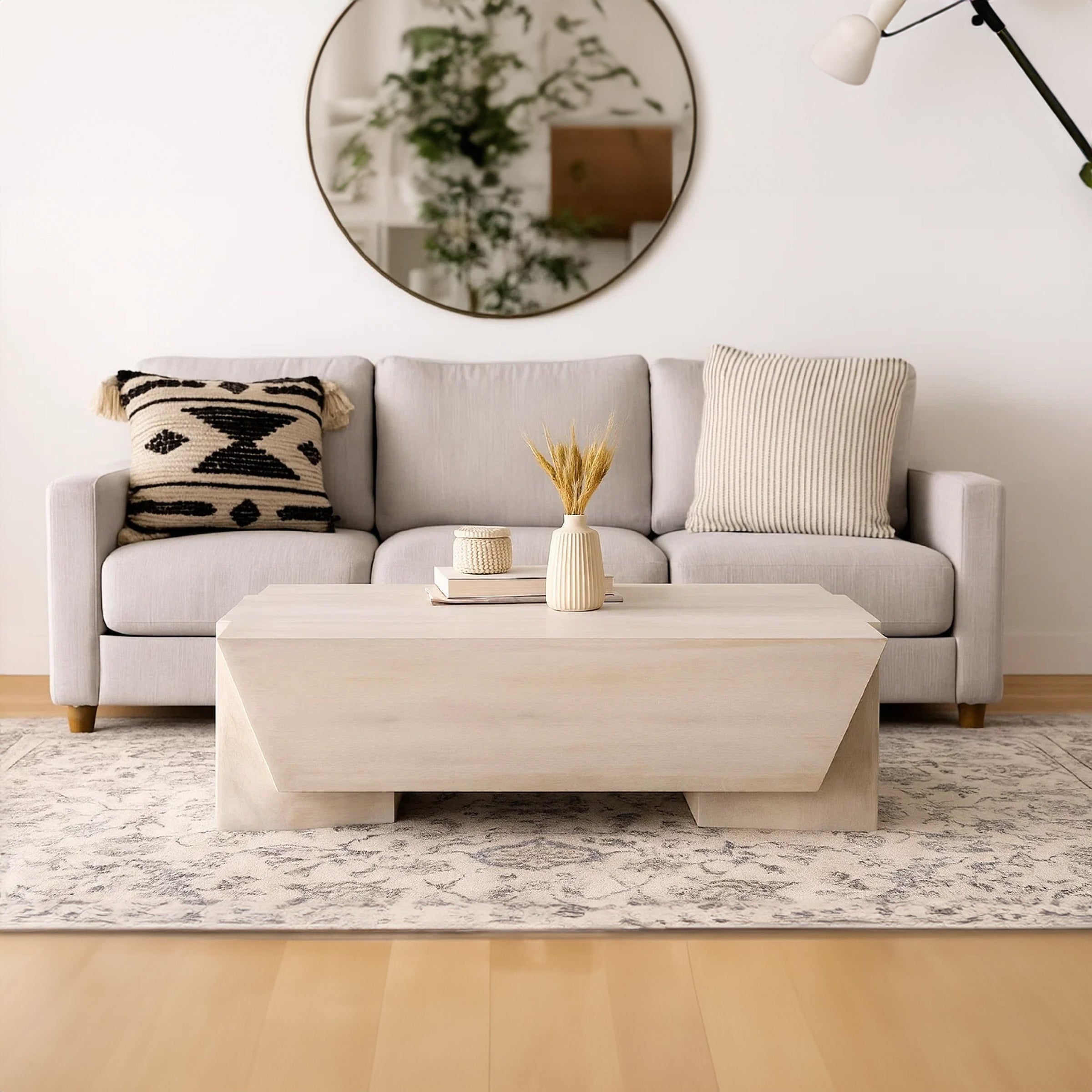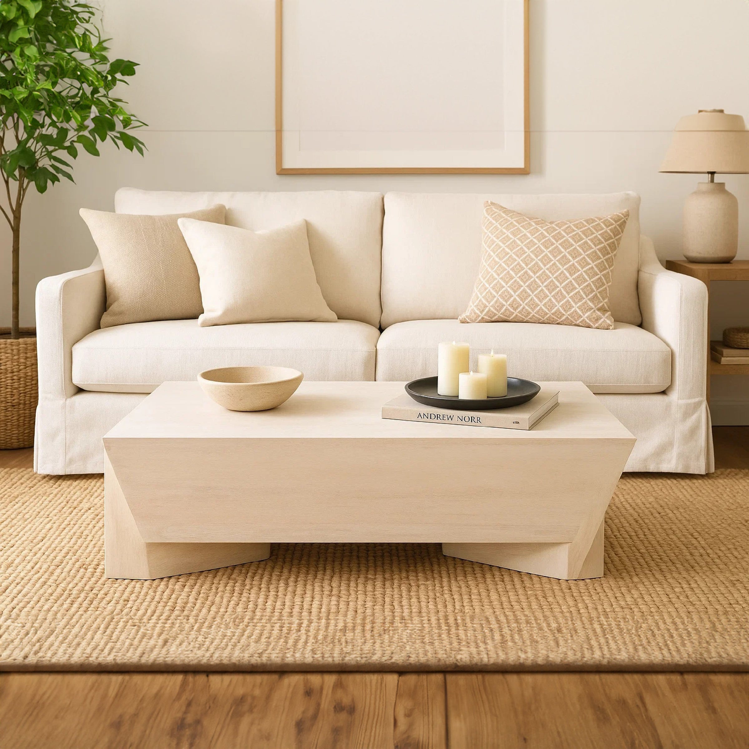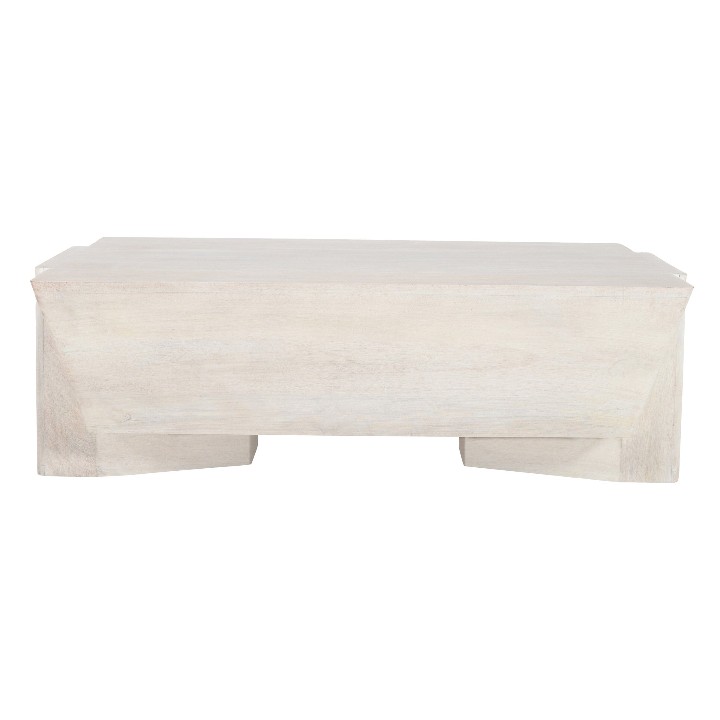 Bring refined sculptural elegance into your living space with this handcrafted coffee table, meticulously made from solid mango wood. Finished in a serene biscotti white tone, the table captures the light beautifully, enhancing the natural grain of the wood while maintaining a soft, airy appeal ideal for coastal, modern, or Scandinavian-style interiors. The design showcases a geometric, tapered sculpture from a broader top to base, giving the piece striking visual contrast while maintaining a solid foundation. The rectangular tabletop offers ample space for serving, displaying books, or anchoring your decor, this artisan-crafted coffee table exudes strength and character making it ideal for everyday living or as a central feature in your entertaining area. Search our Joanie collection if you are interested in more uniquely crafted modern decor furniture with eclectic, dynamic silhouettes.