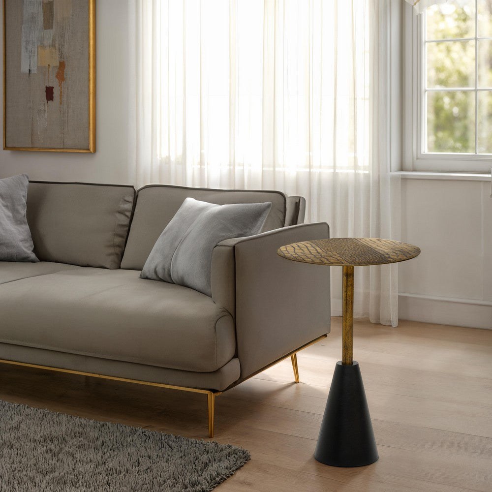 Boldly artistic and inherently modern, this handcrafted drink table brings exotic texture and sculptural design into any living space. Featuring aluminum cast tabletop finished in antique brass, the piece showcases a striking crocodile skin pattern, carefully hand-applied to ensure each table has distinctive variation. The tactile surface lends a high-fashion accent to the compact silhouette. A slender central column and a bold matte black conical base support it. The contrast between the refined, textured top and the grounded, solid base creates a balanced composition that works beautifully in modern, eclectic, or luxe interiors. Perfect for use next to a sofa, reading chair, or bed, this drink table serves as a functional statement piece that elevates your decor without overpowering it. Check out our Zavra collection for more.
