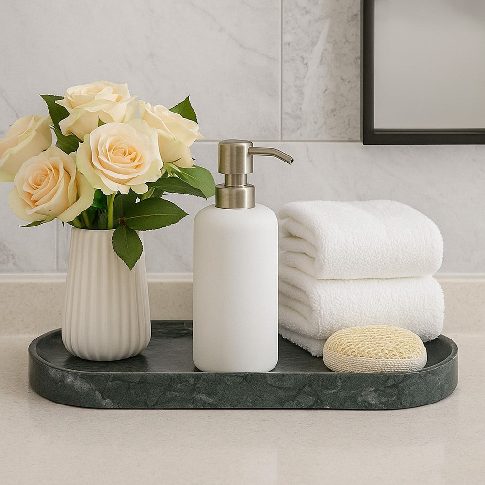 Add a refined touch to your tabletop arrangement with the green marble oval tray. The organic veining adds depth, plus the polished finish enhances elegance. Additionally, its curved silhouette softens the look. Whether used for serving, organizing, or decorating, it offers both function and sophistication in one graceful form.