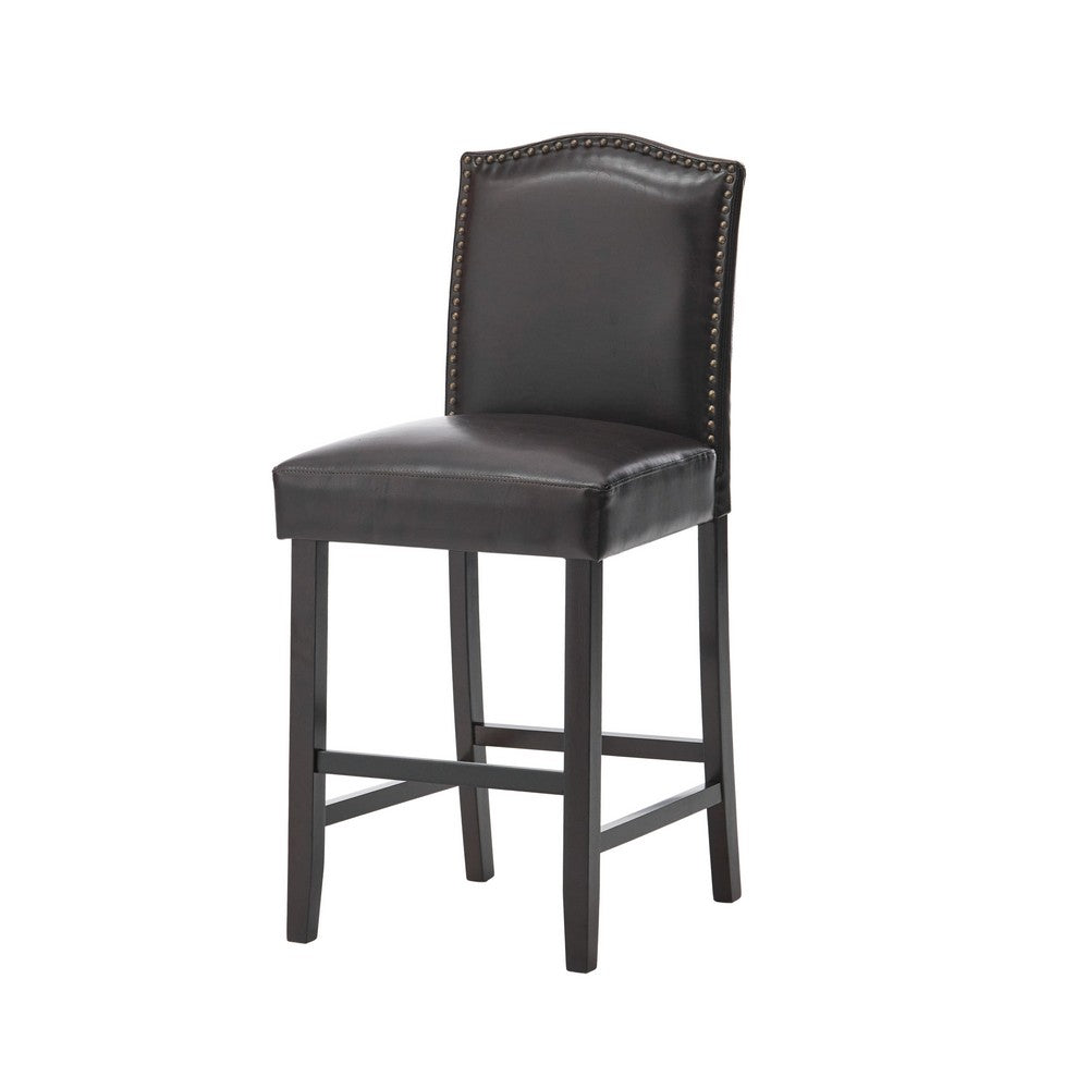 Elevate your home decor with this set of two counter-height chairs. These antique-styled stools feature a luxurious brown faux leather upholstery with copper nailhead trim on the backrest, adding a touch of elegance and craftsmanship. The rubber wood legs, finished in a warm walnut tone, ensure durability and a classic look, making them practical and beautiful additions to your space.