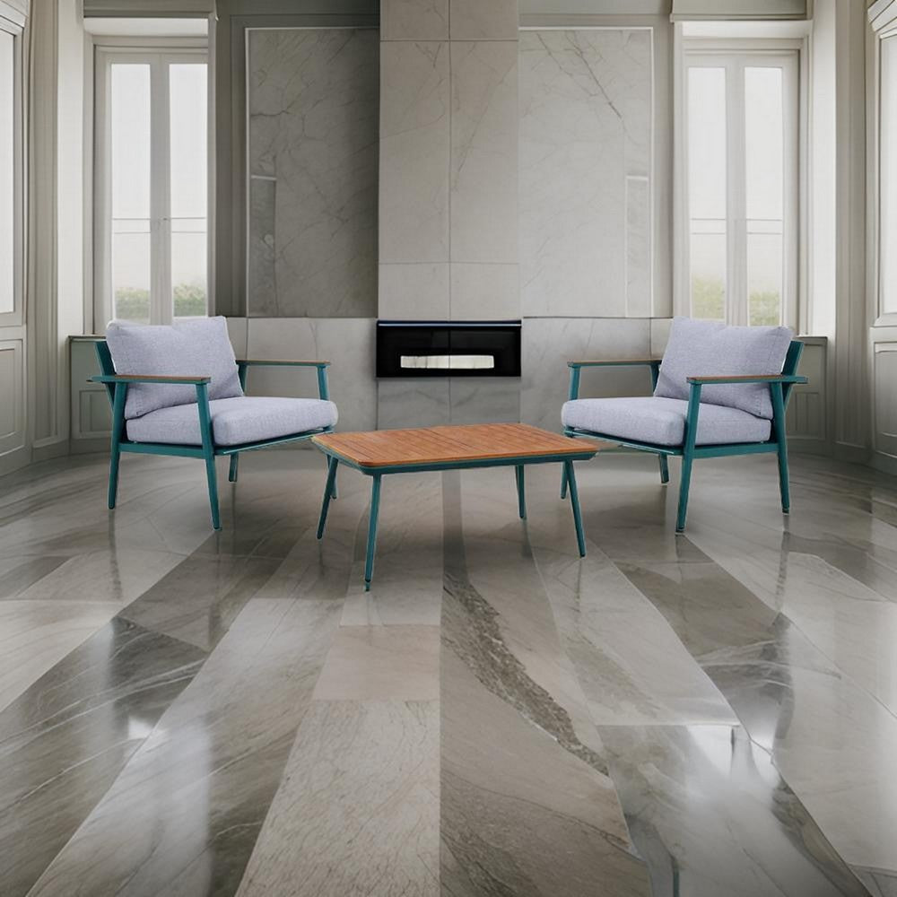 Description:This three piece outdoor coffee table and chairs set is crafted with sturdy metal in a charming transitional style. It features a color combination of gray, green, and oak finishes. The plank style design of the wood tabletop and armrests provides a rustic yet modern aesthetic, with each chair including comfortable fabric cushions for a cozy seating experience.