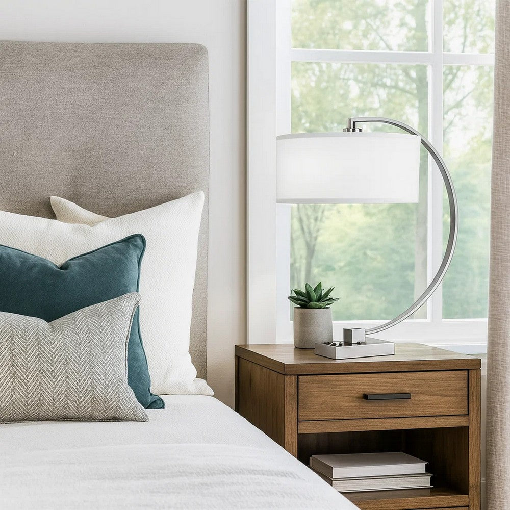 Elevate your space with our Fory table lamp, designed to blend modern style with practicality. Featuring a durable chrome metal construction and a distinctive arc style, this lamp offers both elegance and functionality. It includes one USB port and two power outlets on the base for convenient charging and power. Check out our Fory collection for more.