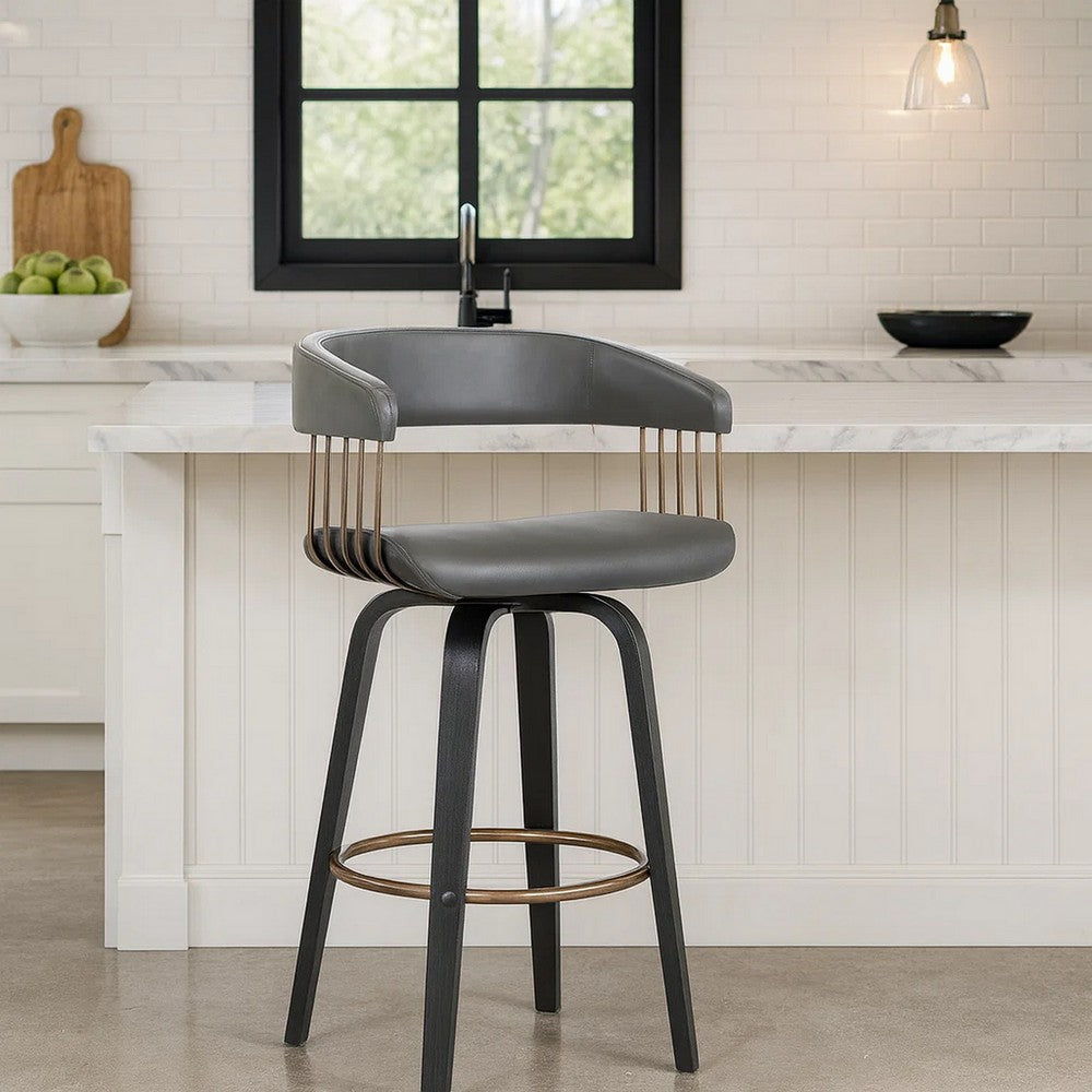 Adorn your kitchen island or counter height table with a warm, modernity style when you choose our Maya counter height chair. Upholstered in soft vegan faux leather in a classic gray tone, it has slatted bronze metal bars and jet black wood legs. All finished off with a round footrest and smooth 360 degree swivel functionality. Check out our Maya collection for sizes and color options.