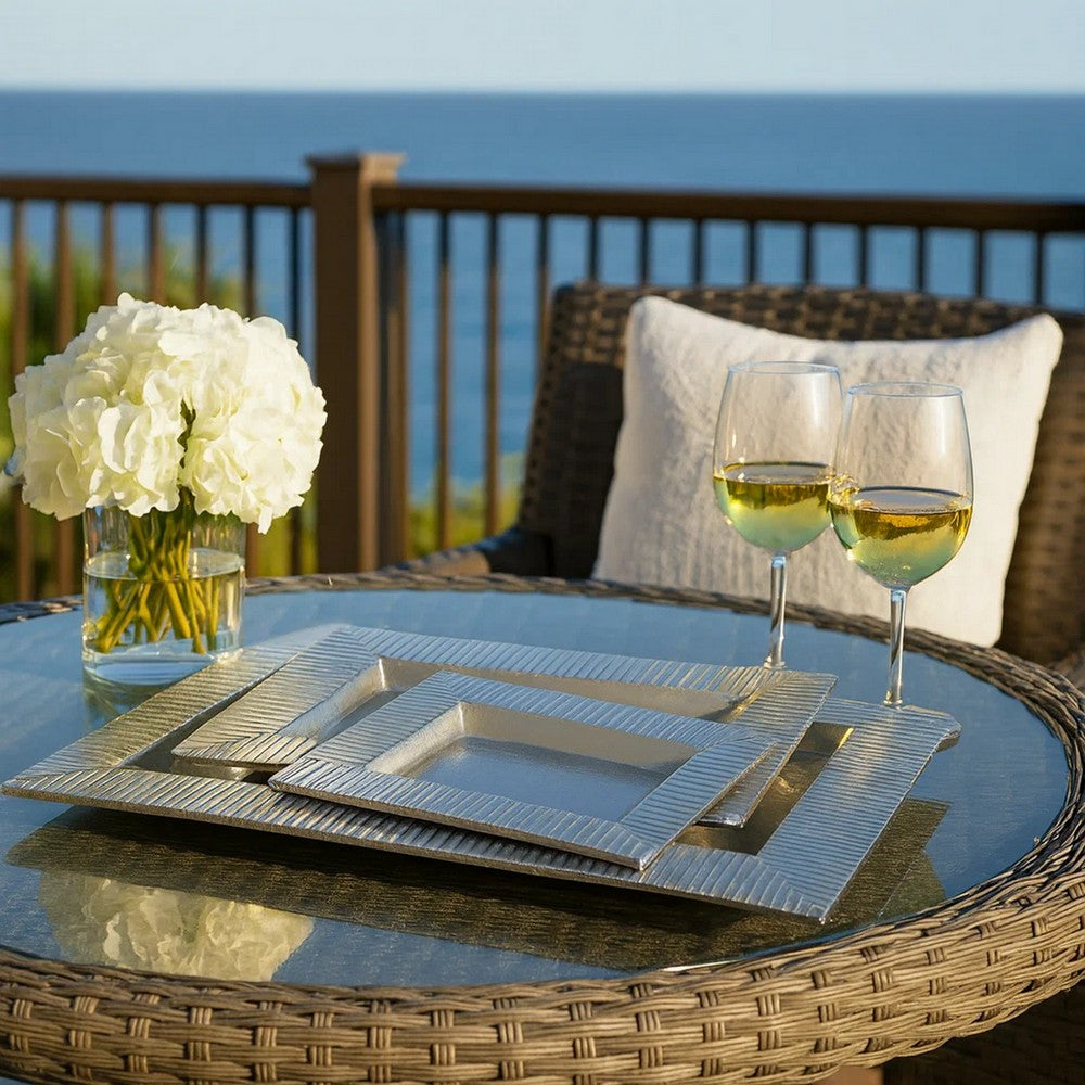 Product weight: 12.43lbSet of three decorative traysDurable metal construction ensures lasting quality and reliability Sleek silver finish adds a modern and sophisticated touch to any space Spacious rectangular shapeElegant wavy edges for a unique and refined appearance Embossed vertical lines for a textured appealVersatile set of three trays in varying sizes for diverse uses Ideal for serving, organizing, or enhancing decor on tables and countertops Perfect for entertaining guests or for daily use, making your space stylish and practical Check out our Nancy collection for more optionsLarge: 20L x 12W x 1.5H, in inchesMedium: 16L x 10W x 1.5H, in inches Small: 12L x 9W x 1H, in inches