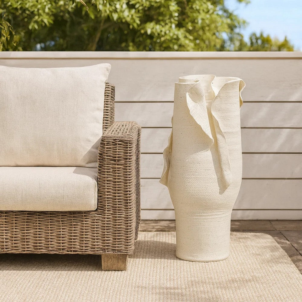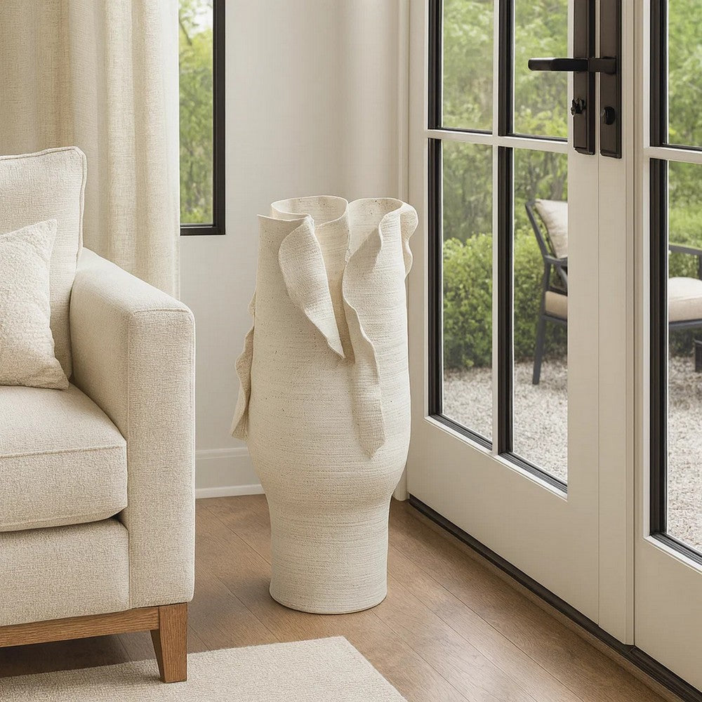 Graceful and artistic, this 19 inch decorative art statue of a vessel captures the beauty of fluid motion in porcelain form. Featuring free flowing petal folds and hand textured torn edges in matte white, it adds an elegant touch to any space. Perfect for fresh flowers and safe in mild outdoor conditions, this sculptural piece is visually striking. Explore the Tio collection for more.