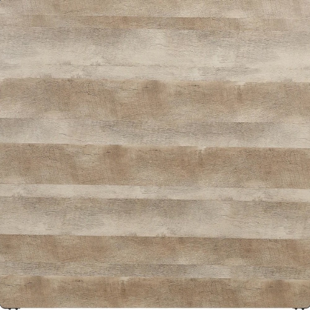 - Wide, fixed, rectangular table top with metal rivets at the corners