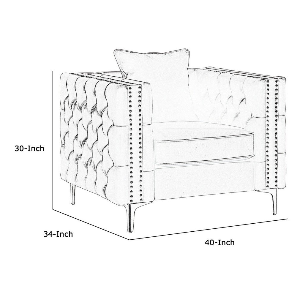 Anchor your space in modern style with this Sofa Chair. It s velvet upholstery is tufted on both the inside and outside of the frame and it is adorned with double rows of nail head trim. Thick seat cushion and accent pillow provides comfort, while metal legs provide support.