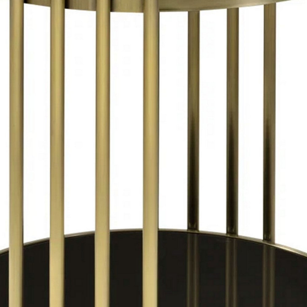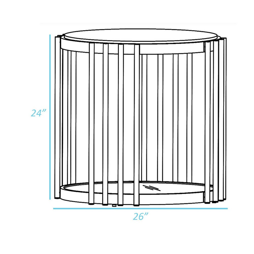 Crafted with meticulous attention to detail, our Kein round side end table features a striking faux marble top, adorned with a replicated pattern that immediately captures attention. The black tint tempered glass bottom creates a mesmerizing visual contrast, while the antique brass finished steel frame lends a vintage touch to the table. Check out our Kein collection for matching items.