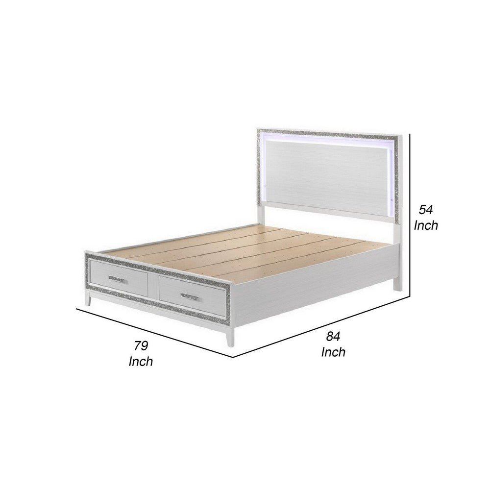 King Size Storage Bed, Elegant Silver Glitter Trim, LED Lit Headboard, White - BM296882
