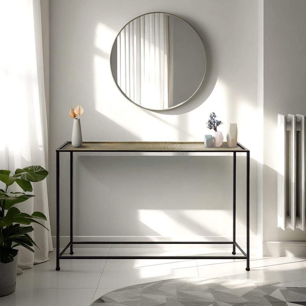 Aurelia 48 Inch Console Sofa Table, Artisanal Hammered Antique Bronze Tray Top, Industrial Black Iron Frame - UPT-286692