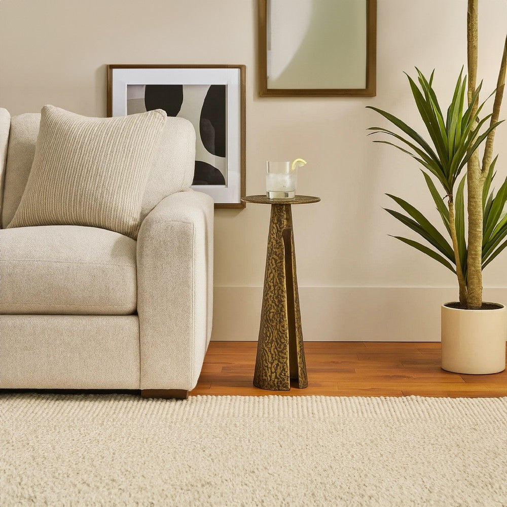 Striking a perfect balance between sculptural elegance and artisan texture, the Arvyn handcrafted drink table is a distinctive design statement for any contemporary or transitional living space. Expertly handcrafted from aluminum cast, this table features a rich antique brass finish that brings warmth and metallic depth to your interior. Its embossed texture lends a captivating tactile and visual richness, offering a natural variance in a pattern that ensures no two tables are exactly alike and enhancing its handmade, artisanal character. The tapered, cone-shaped base adds architectural interest while enhancing the piece’s overall lightness and airiness. Explore our Arvyn collection to see more.