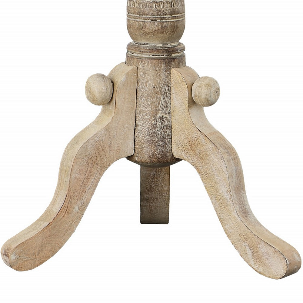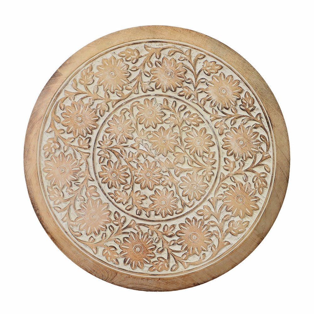 Embellish your existing decor setting by bringing in this transitional style Handmade End Side Table which showcases intricately carved details and offers a round tabletop. Constructed from mango wood frame, it is accented with brown finish with a subtle hint of white color embellishment on the top. This piece of furniture can serve as an abode for all your exotic decor items and at the same time will impart an enchanting appeal to your place.