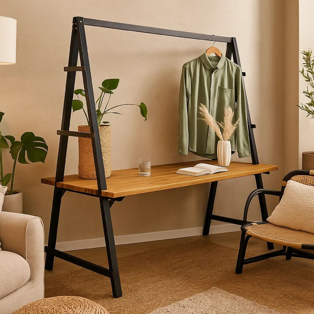Transform your patio into a stylish retreat with the Jo outdoor pergola table. Made from acacia wood with a teak brown slatted top for easy drainage, it features a bold black metal A-frame pergola for hanging lights or décor. Wide ladder-style legs add industrial charm and stability, making it ideal for cozy meals or inspired outdoor gatherings. Check out our Jo collection for more.