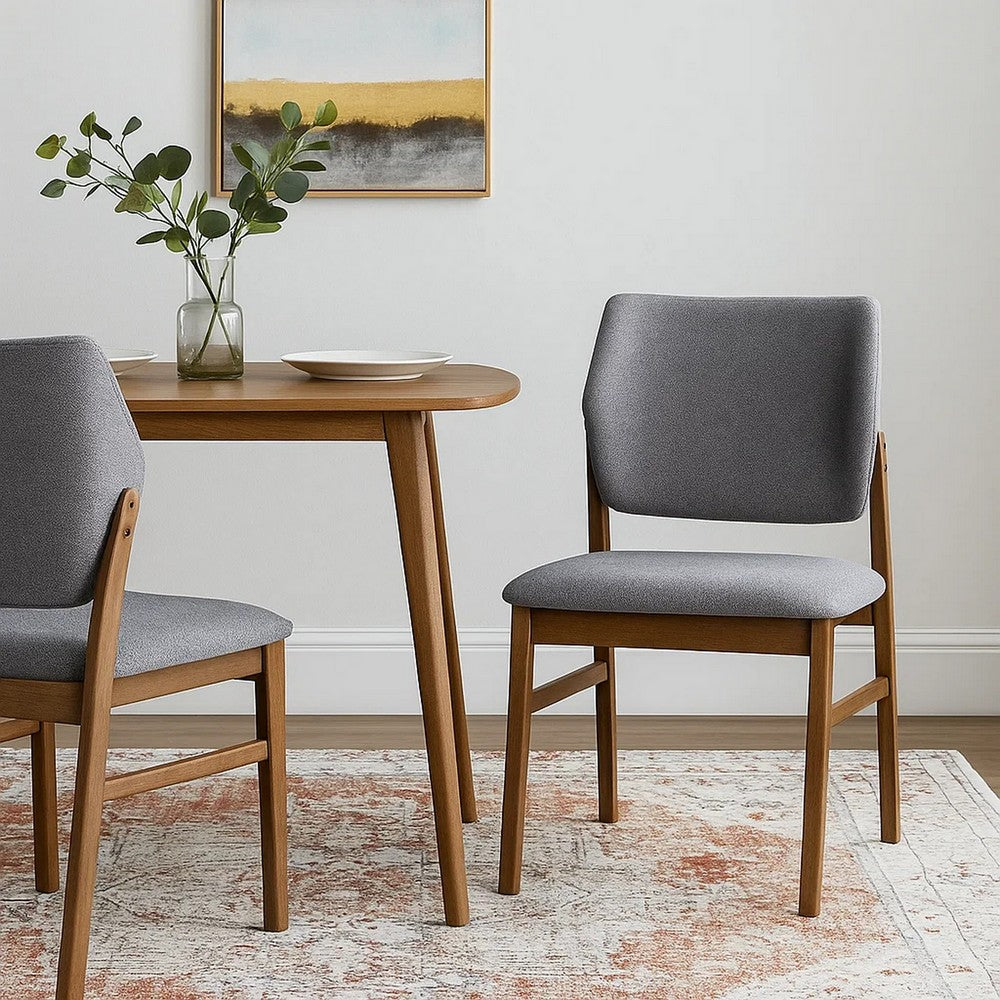 Bring warmth and comfort to your dining space with the Nory set of two dining side chairs. Featuring light gray linen upholstery over padded seats and backs, these chairs offer both style and coziness. The rich walnut brown finish and tapered legs add timeless appeal and stability. Check out our Nory collection for more options.