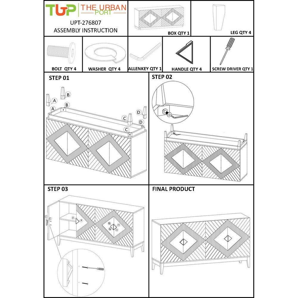 Depicting an artisanal diamond carved design, this mango wood sideboard buffet cabinet from our best-selling Abiel collection perfectly fits your dining room, foyer, kitchen, or living room. Expertly handcrafted from durable mango wood in a vintage gray finish and composite wood back panel, this piece has sandblasted wood handles in gold finish with white epoxy resin accents for a distinguished aesthetic charm. Featuring four soft-closing doors, each cabinet opens to reveal a storage shelf to keep utensils, table linens, jars, containers, and more. Supported on block tapered legs, this sideboard cabinet blends with various decor styles, such as traditional, transitional, rustic, cottage, or modern and contemporary. The wide rectangular top offers plenty of space to showcase your hand-curated decorations, kitchen accent items and appliances, lamps, vases with flowers, and more. Check out our Abiel collection for more color options.