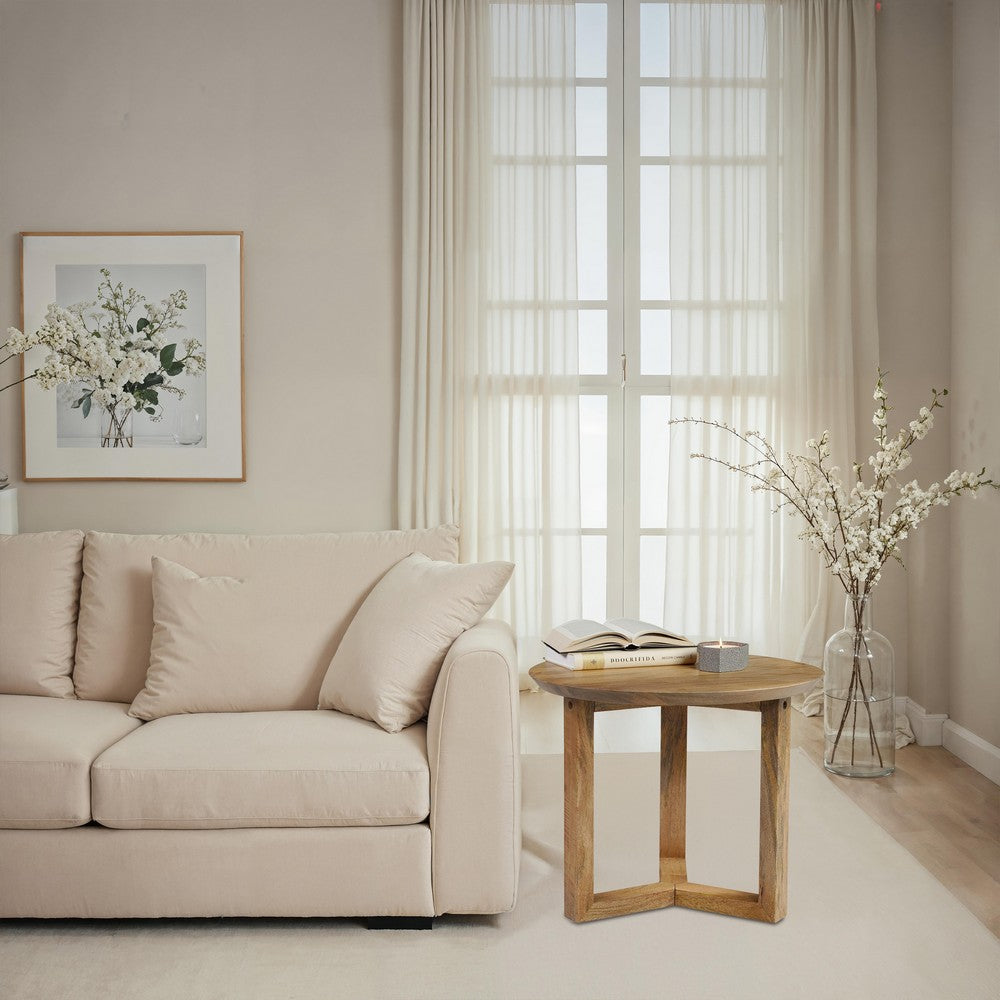 Bring natural charm and functional elegance into your home with this handcrafted wooden end table, designed from solid mango wood and finished in a warm natural brown tone, this compact accent piece enhances both casual and refined interiors. The smooth circular surface makes this table ideal for both functional and decorative use. Finished in a natural brown tone, the table highlights the inherent beauty of the wood. The three-legged base creates a visually striking foundation that ensures both stability and style. Its clean, geometric silhouette allows for a light, airy feel while still offering reliable support. Check out our Nina collection for matching pieces.