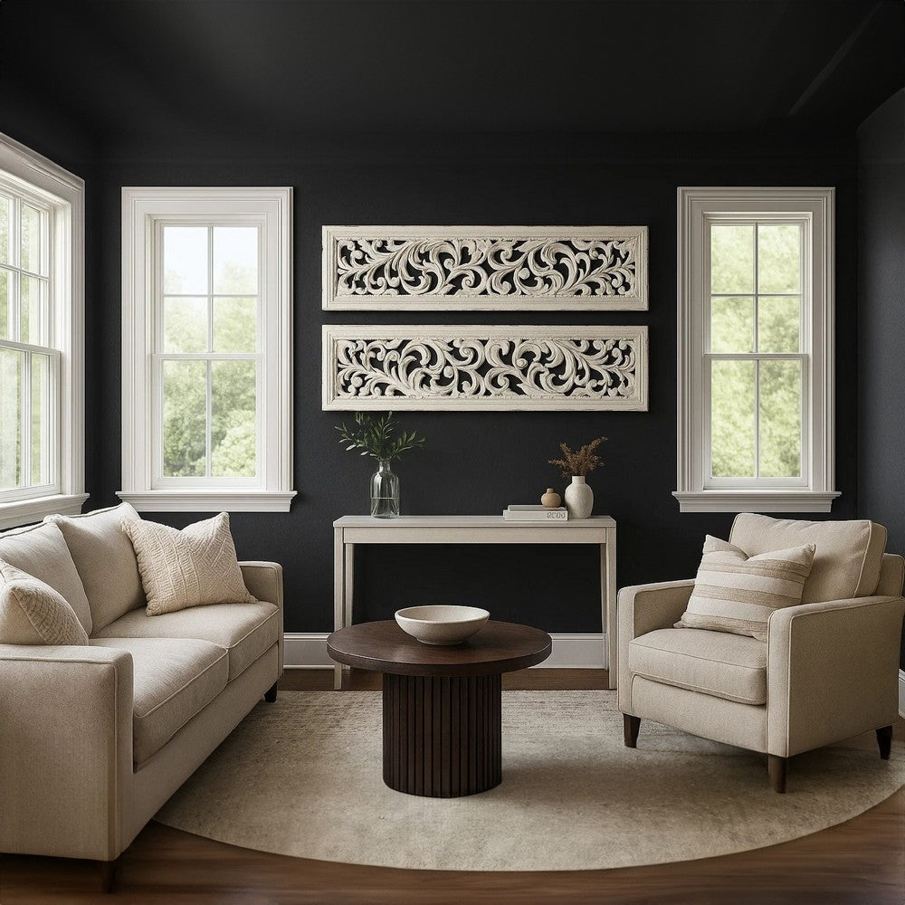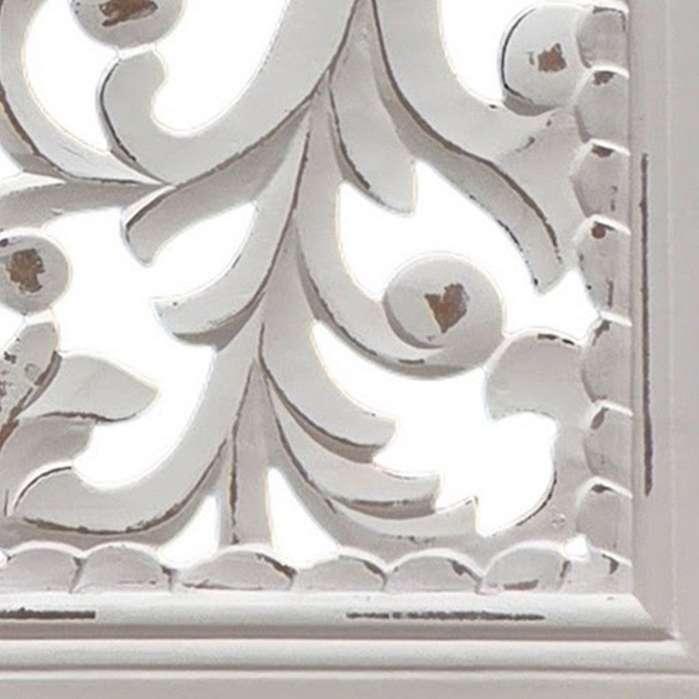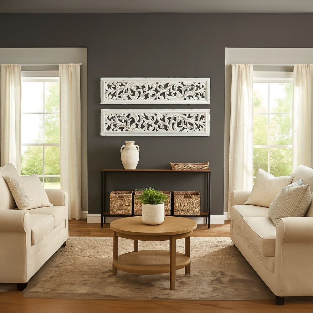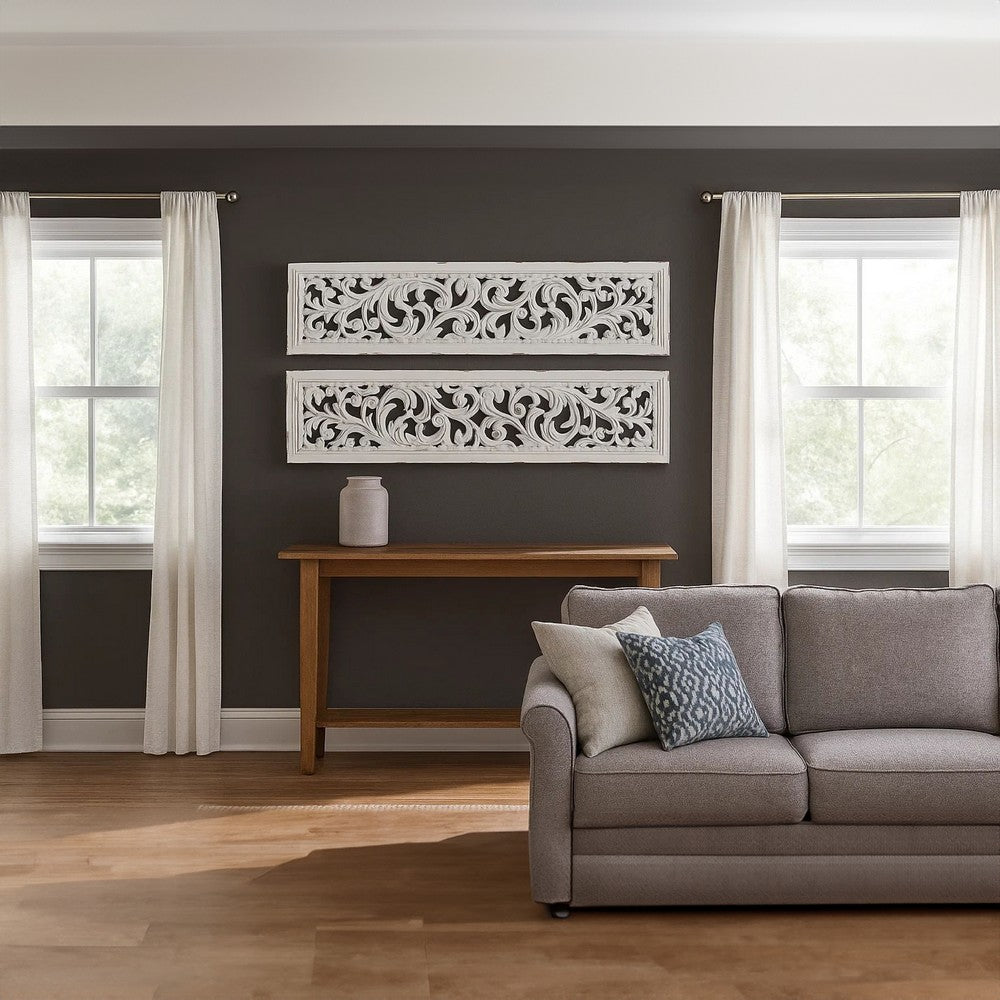 Elevate your interior décor with this exquisite wall panel set, a blend of traditional craftsmanship and timeless elegance. This set of two intricately designed panels showcases a flowing botanical motif, artistically carved into durable MDF and framed in solid mango wood. Finished in a charming distressed white, each panel adds a touch of vintage character while offering modern versatility for a variety of spaces. Whether used vertically to flank a doorway or horizontally above a sofa or bed, these panels bring a sophisticated ornamental element to any wall. Their open scrollwork design creates visual interest while allowing wall color to peek through, making them an ideal match for rustic, shabby chic, farmhouse, or French country interiors. Explore more Ozy collection for matching pieces.